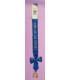 Banda confeccionada en cinta de raso de 100 mm disponible en colores, letras bordadas en hilo de oro, pasamaneria alrededor del frontal de la banda con forro blanco, con plastón blanco bordado el escudo de la localidad, rematada con un lazo a la altura de la cintura y terminada con dos borlas doradas.