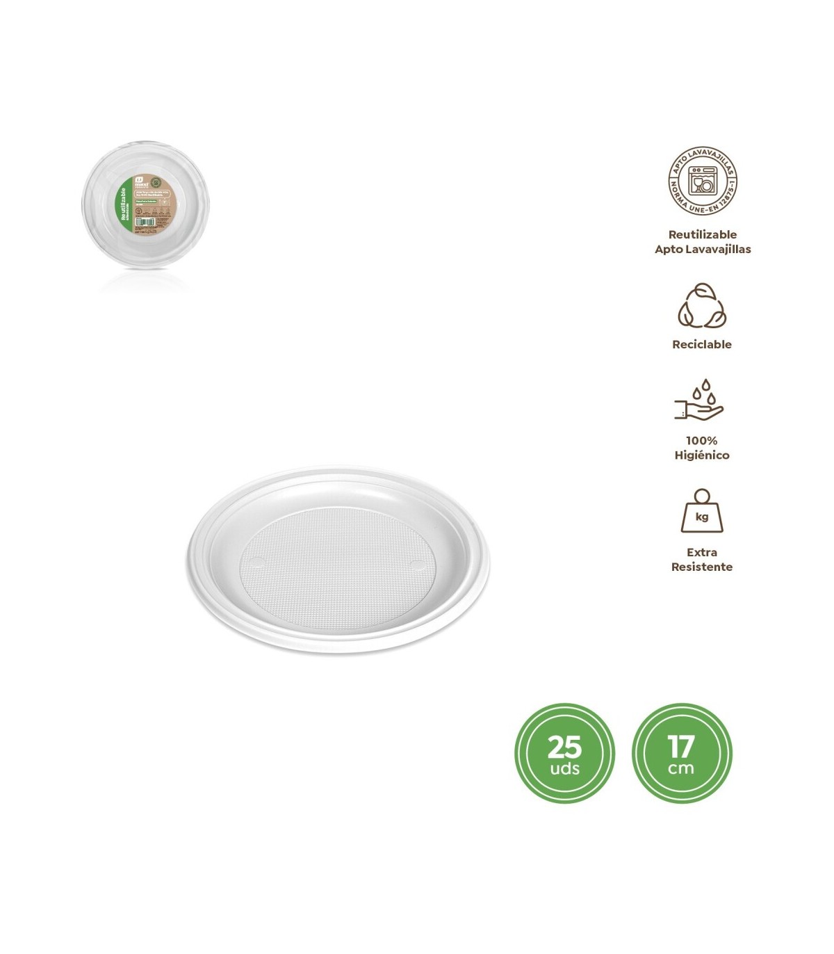 Este paquete de 25 platos blancos reutilizables es la solución perfecta para quienes buscan un equilibrio entre la practicidad de un evento y el consumo responsable. Con un tamaño de 17 cm, son ideales para servir postres, aperitivos, tarta o pequeñas raciones en cualquier tipo de celebración.