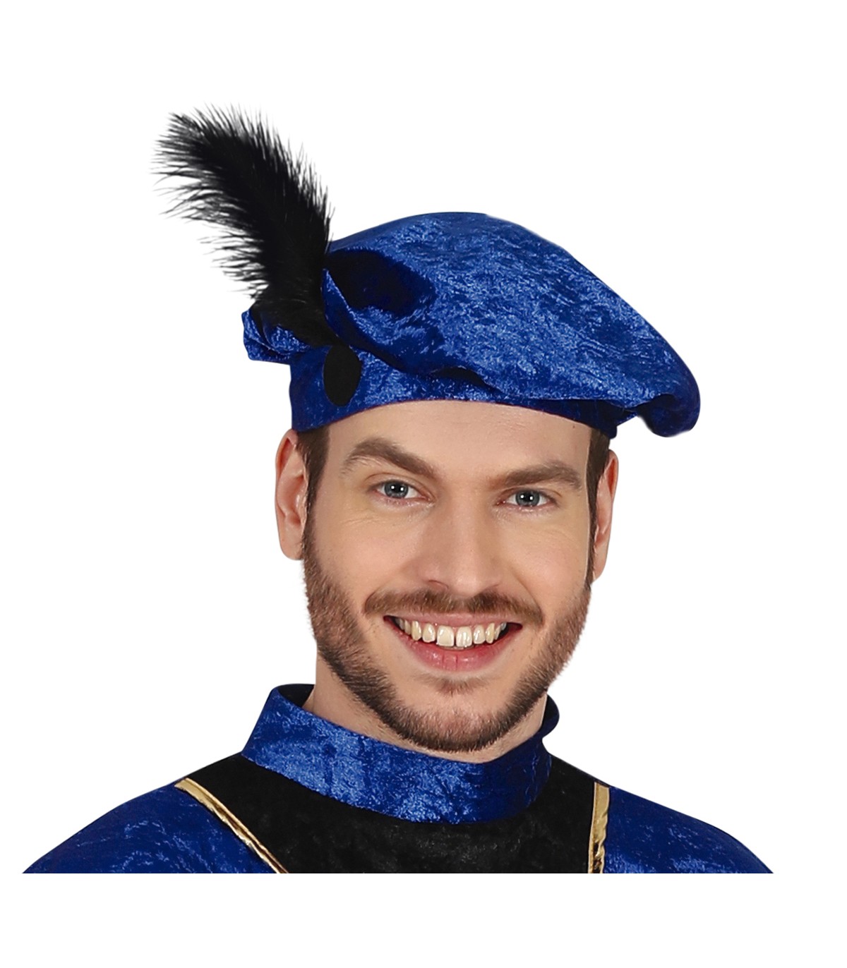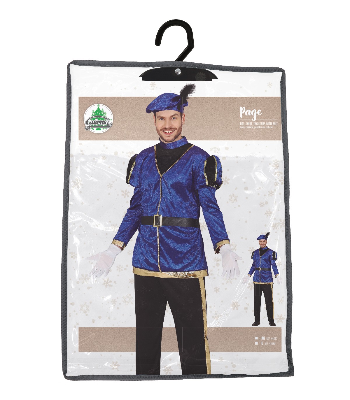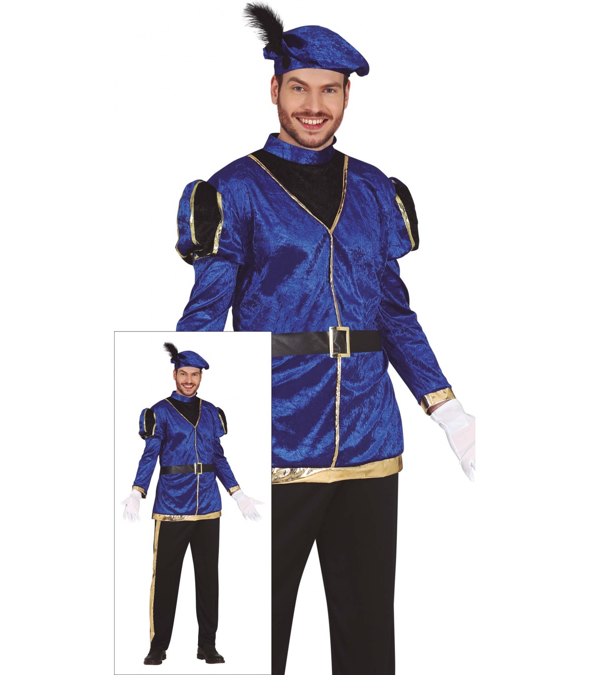 El disfraz de paje azul contiene casaca, pantalón y gorra.