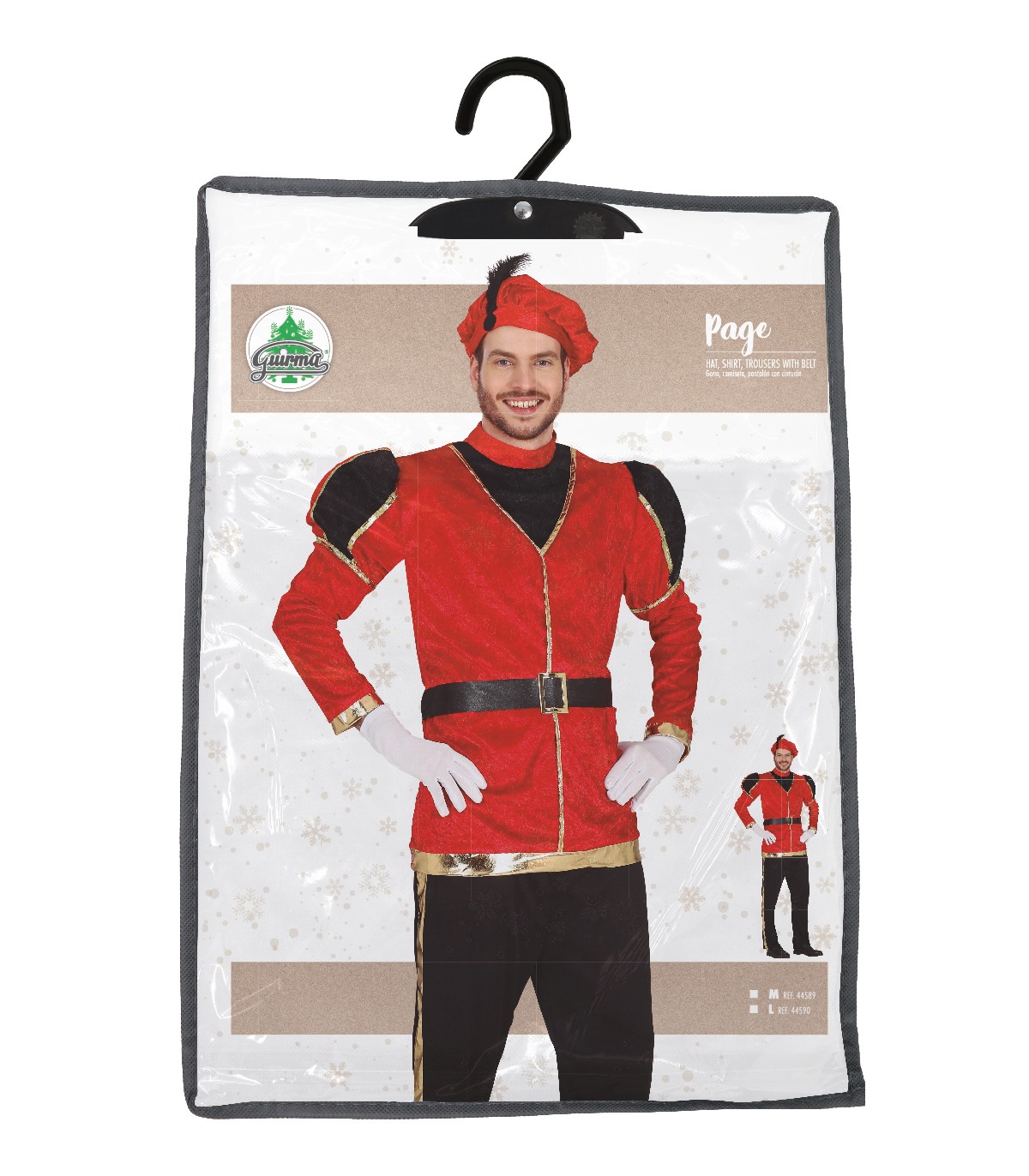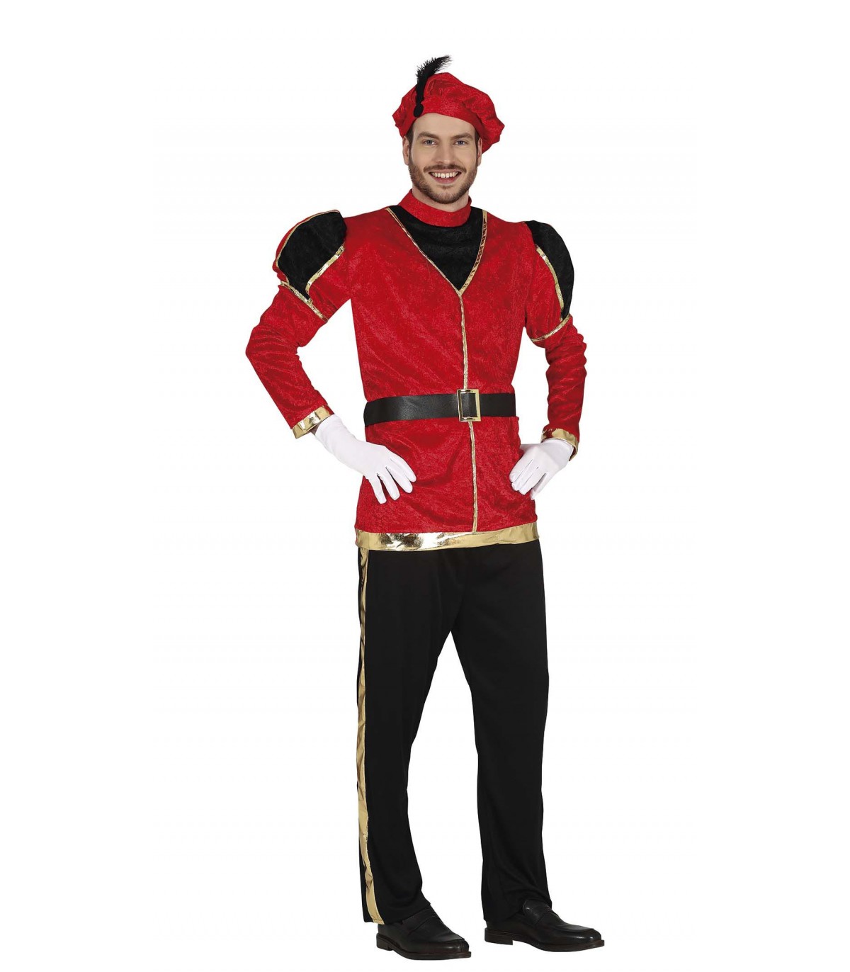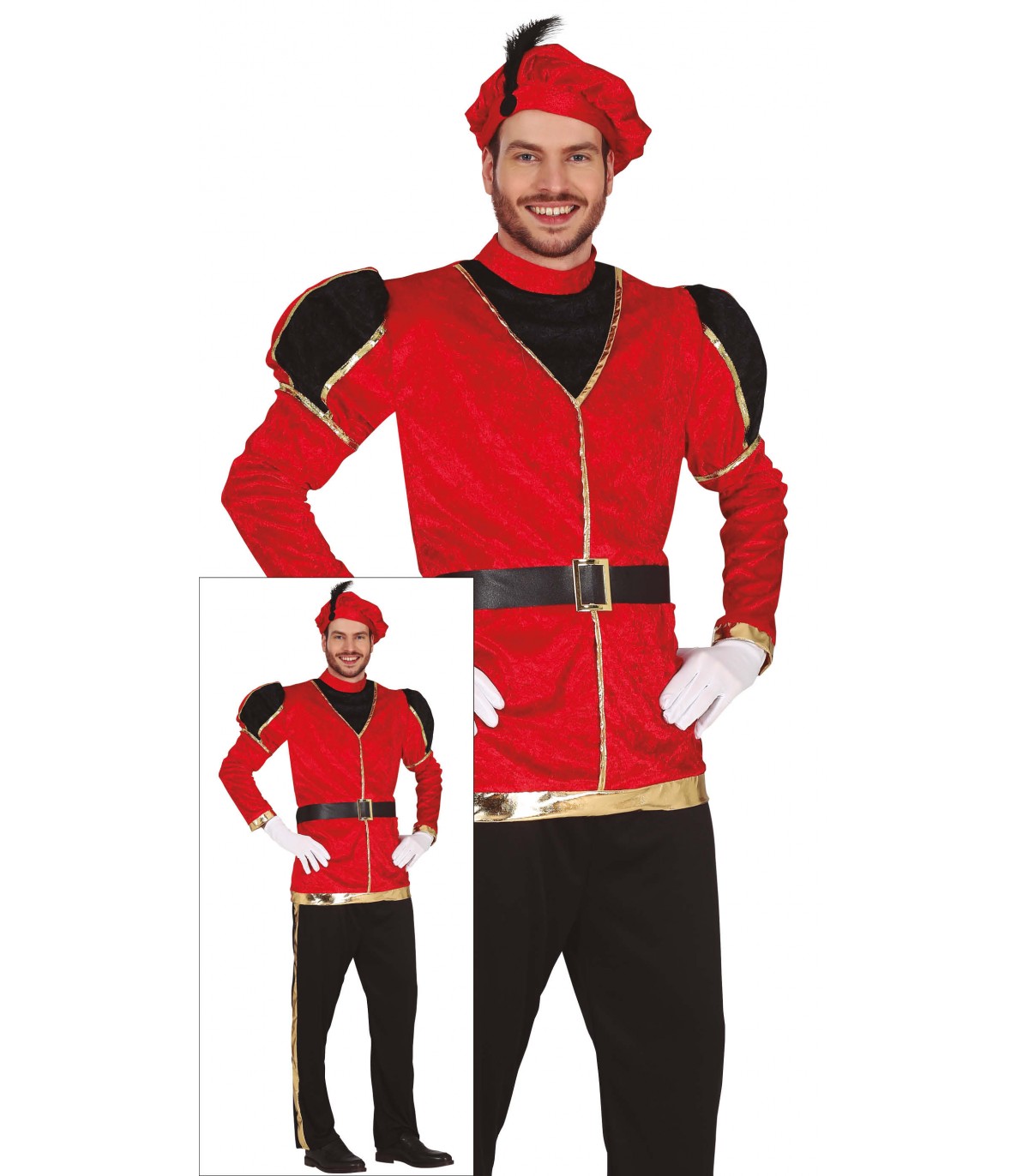 El disfraz de paje rojo contiene casaca, pantalón y gorr