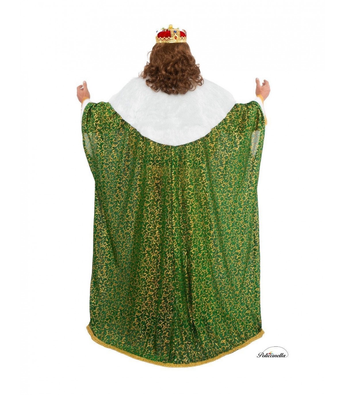Luce con distinción este espléndido disfraz de Rey Gaspar, ideal para cabalgatas y representaciones reales. La casaca larga en tono dorado, confeccionada en poliéster, se cierra al cuello y se combina con una imponente capa verde con estampado dorado, rematada con cuello y puños de pelo blanco semirizado. El fajín a juego, ajustable con velcro, realza la silueta y aporta un toque regio, mientras que las babuchas doradas completan el conjunto. Un traje que une elegancia, tradición y presencia majestuosa en cada detalle